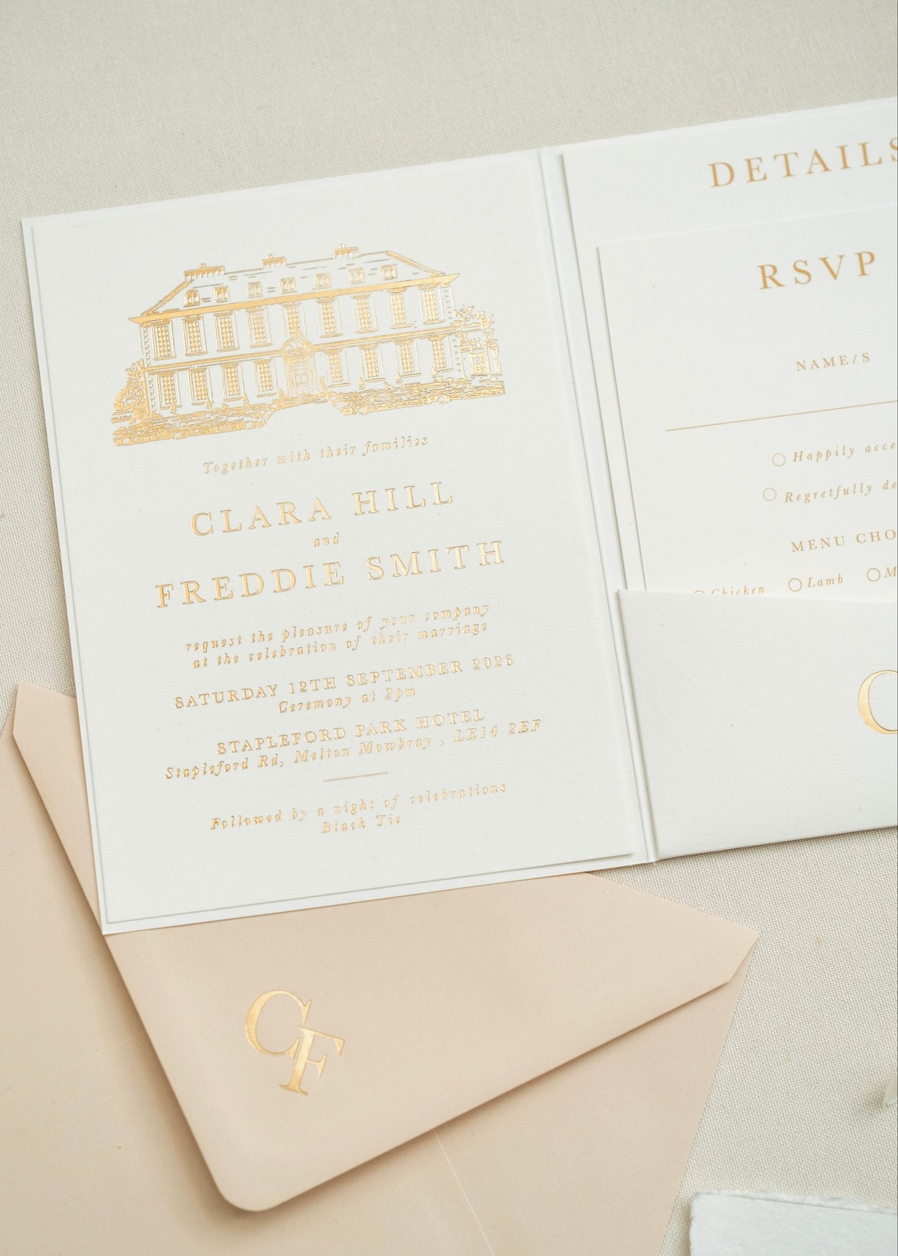 Main invitation card printed in stunning foil (available in gold, silver, rose gold, and more)