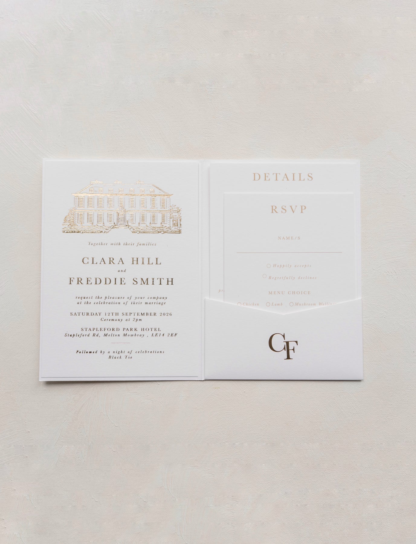 Let your wedding stationery tell your love story with the Clara Wedding Venue Illustration Pocketfold Invitation, designed to make a lasting impression from the moment it arrives.