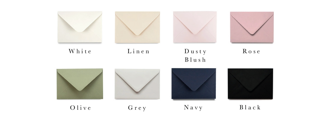 Here are our most popular envelope colours, chosen to complement a range of stationery designs. If you have a specific shade in mind, we can source alternative options to match your palette, depending on the paper stock and availability. Please note that special colour requests may incur additional fees.