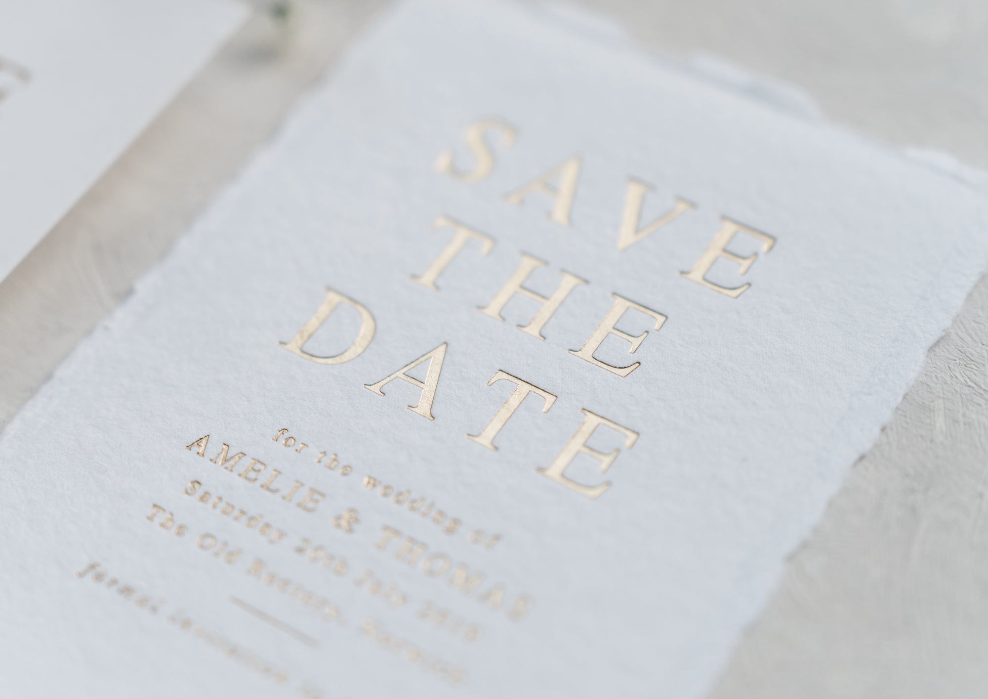 Your design is pressed into the card, creating a debossed finish that adds a luxurious texture. Metallic foil adds a shimmering, premium effect, making it perfect for monograms, venue illustrations or special accent details on both light and dark card stocks.
